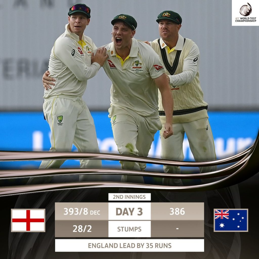 After pocketing a slender first-innings lead, England openers, quite uncharacteristic of their recent approach, were watchful against the new ball. However, a slight rain break coupled with strong winds and overcast conditions came to the aid of the Aussies, who managed to scalp both openers in the space of four deliveries, leaving England two down for 28 at stumps.
