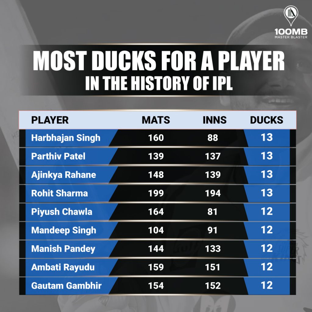 Though no batsman in the world wants his name up in the list of most ducks, there are many surprising names who are dominating the race of scoring most ducks in the Indian Premier League. The veteran off-spinner Harbhajan Singh is topping the said charts with 13 ducks to his name in 88 innings. He is followed by the wicket-keeper opening batsman Parthiv Patel and Delhi Capitals swashbuckling batsman Ajinkya Rahane. Both Parthiv and Ajinkya have 13 ducks in 137 innings respectively.