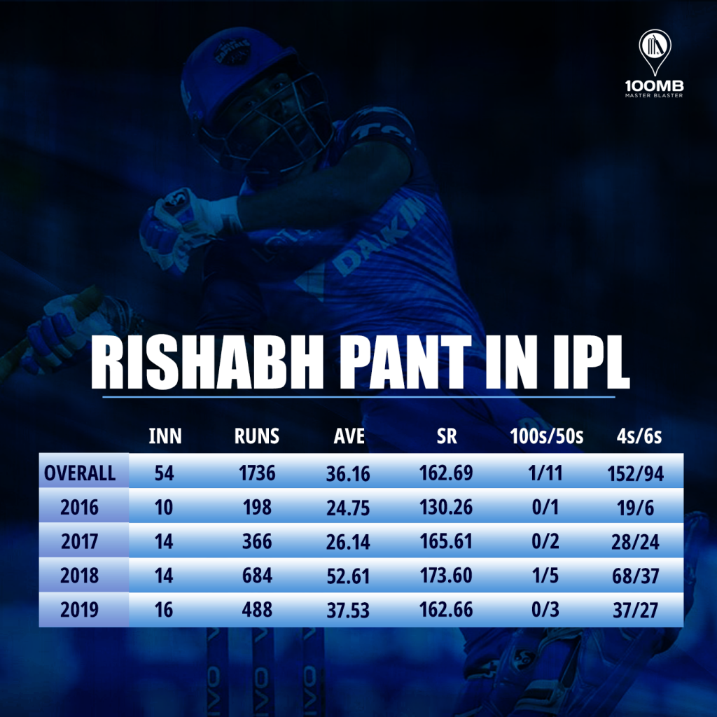 Across 54 IPL innings thus far, Rishabh has aggregated 1736 runs which are the 5th most runs by any player since his debut season. Virat Kohli (2275) and David Warner (2181) are the only players with 2000+ IPL during this period. If we consider the number from the 2017 season, Pant would top every other player having scored 1538 runs in 44 innings at an average of 38.45 and at a strike rate of 168.09.