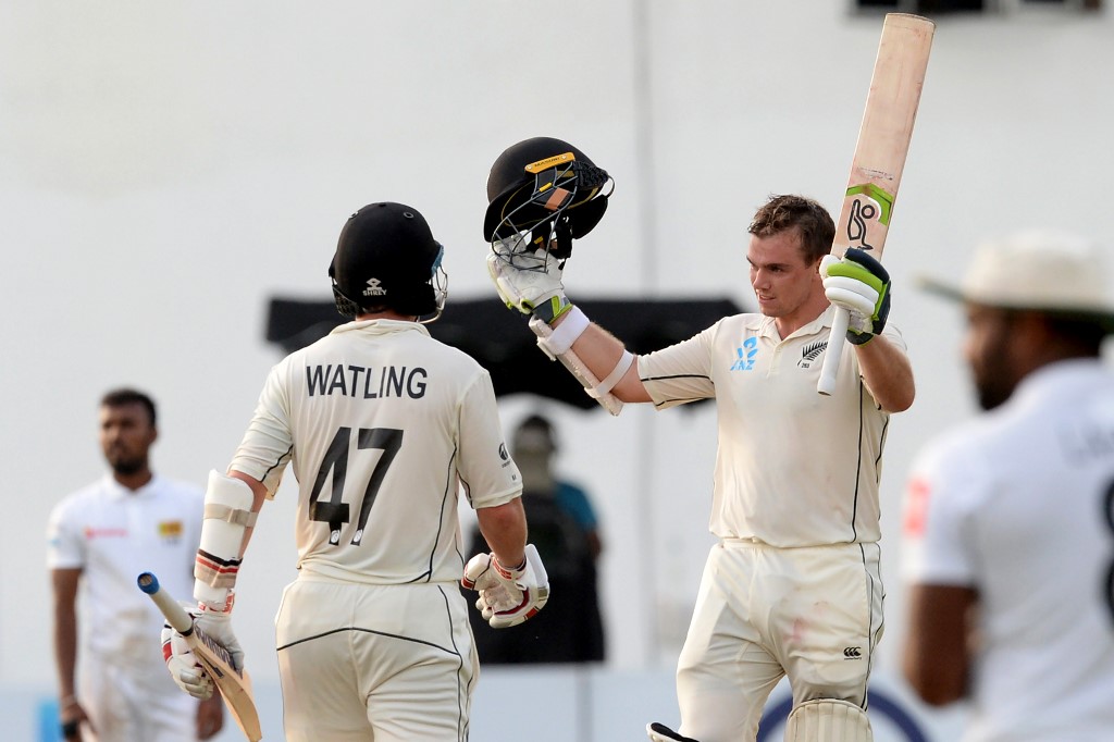 New Zealand’s cricketer Tom Latham (R) raises his bat and helmet in celebration after scoring a century (100 runs) as his teammate BJ Watling (L) looks on during the third day of the final cricket Test match between Sri Lanka and New Zealand at P. Sara Oval cricket stadium in Colombo on August 24, 2019.