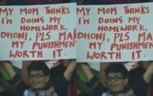 IPL is especially known for attracting a huge amount of interest from youngsters. An evident example was seen in a match between two arch-rivals, Chennai Super Kings and Mumbai Indians. During the match, a kid was seen holding an amazing banner. It stated that he is skipping his homework in order to watch this match and is asking Dhoni to make his punishment, which he will receive for not doing his homework, worth. In a way, he was asking MSD to play a stunning match-winning knock. A similar poster was seen in the hands of a South African fan in an international match.