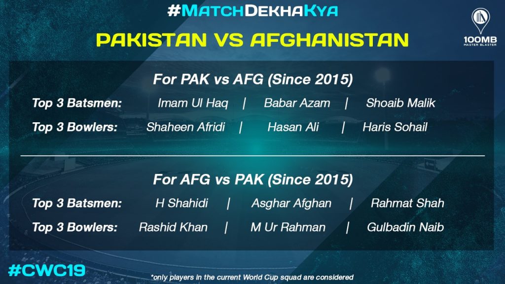 This will be the first World Cup meeting of these two teams. Pakistan and Afghanistan have played three ODIs against each other so far and Pakistan has dominated the younger team with three wins. In the 2018 encounter, Afghans were closing on a win when Shoaib Malik sealed a three-wicket victory for Pakistan.