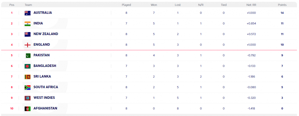 Last to get into the tournament, the team still has two matches remaining in the fixtures. With five wins and one point from the rained-off match, India are favourites to end in the top two spots. They need to win one more game to confirm the semi-final and two more wins will help them challenge Australia for the top spot. India play Bangladesh and Sri Lanka next.