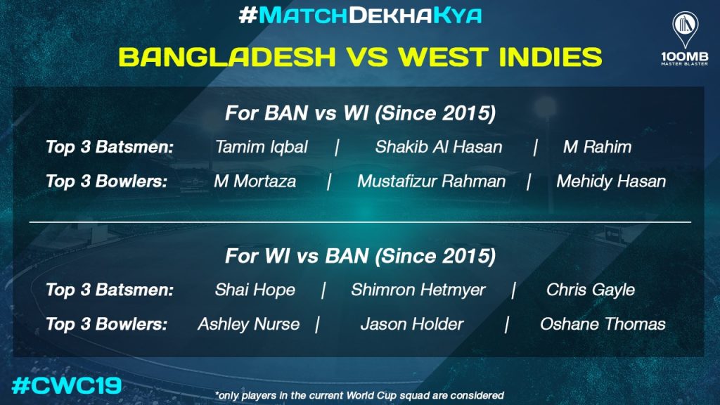 West Indies had to qualify to be at this World Cup, Bangladesh didn’t. The very fact conveys the progress of this Asian team in white-ball cricket. With humongous experience at their exposure, they can be a tough proposition on their day. Bangladesh will rue the fact that their last match against Sri Lanka was a washout. A win over West Indies will boost their confidence.