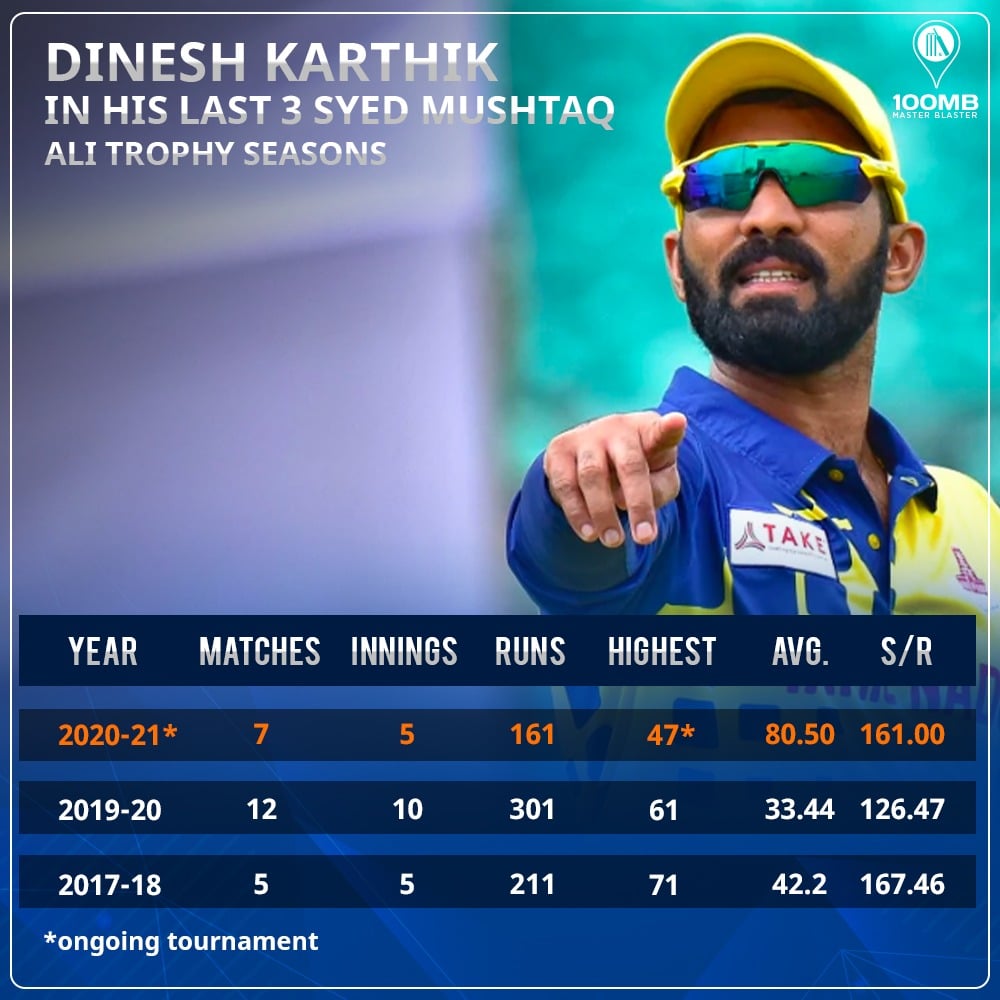 With opportunities not available in the international circuit, Karthik has displayed his batting dominance in the Indian domestic cricket. Playing for his native state of Tamil Nadu, the wicketkeeper-batsman boasts of a dazzling record. Here’s his record in the last three Syed Mushtaq Ali Trophy seasons that he has played in.
