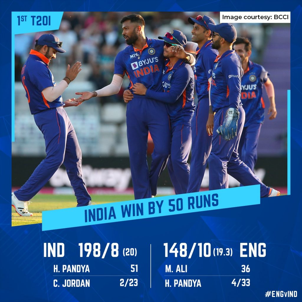 India registered an emphatic 50-run win over England in the first T20I at The Rosebowl in Southampton on July 7 to draw first blood in the three-match series. This morale-boosting victory was possible courtesy of a brilliant all-round performance from Hardik Pandya who scored a half-century and then went on to register a four-wicket haul.