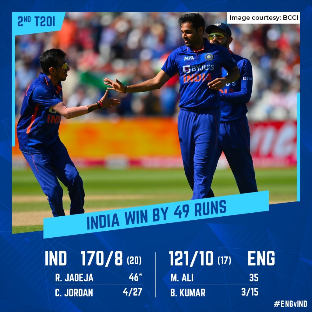 India won by 49 runs against England in the second T20I on July 9, Saturday, to take an unassailable 2-0 lead in the three-match series. Pacer Bhuvneshwar Kumar was given Player of the Match for his bowling performance, finishing with three wickets for 15 runs in three overs, including a maiden.