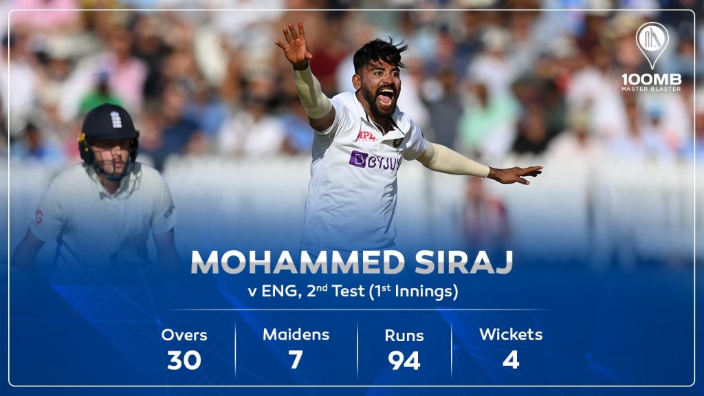 Mohammed Siraj bowled his heart out throughout the day. There was not much swing or help from the surface but the man kept running in to deliver for his team. He eventually ended up with four wickets of Sibley, Hameed, Bairstow and Robinson in the innings. Siraj returned with the figures of 4/94 in 30 overs, the most bowled by an Indian bowler in the innings as well.