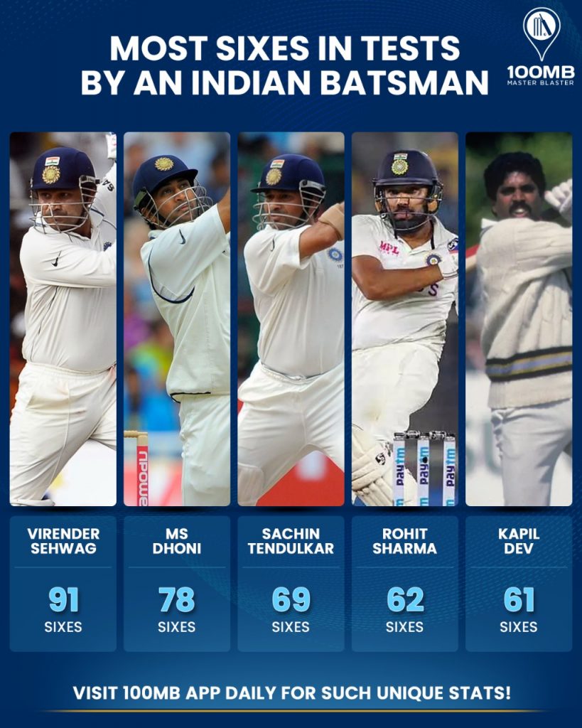 62 – Rohit Sharma recorded his 62nd six in Test cricket, the fourth-most for any Indian. Only Virender Sehwag (91), MS Dhoni (78), and Sachin Tendulkar (69) are ahead of him in this tally.