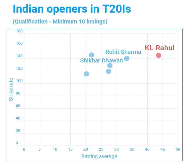 Thus far only six Indian batsmen have opened in more than 10 T20Is. Amongst them, Rahul stands out with an average of 43.68. The next best is Rohit who averages around 33. Rahul’s strike rate of 145.02 is only second to Virender Sehwag who struck 145.38 runs every 100 balls. However, Sehwag’s average (21.88) remains less than half of Rahul’s.  Even in comparison with legendary names in Indian cricket, the current opener thus holds his own.