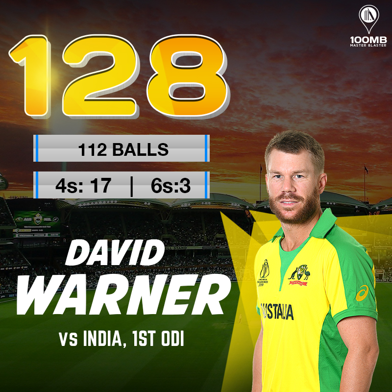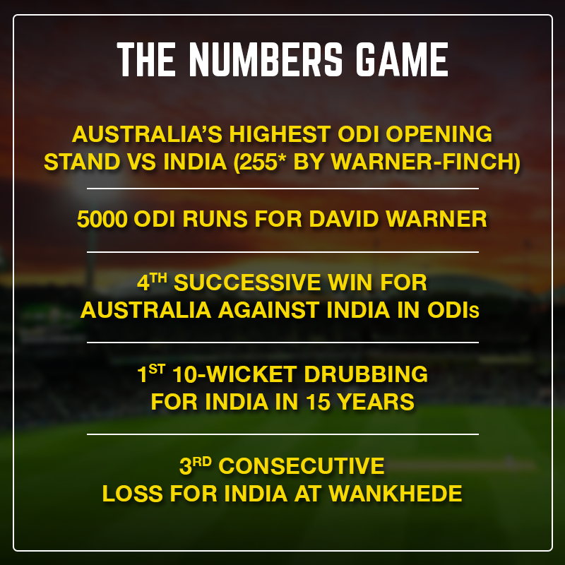 David Warner and Aaron Finch smashed unbeaten centuries as Australia cruised to an emphatic 10-wicket win against India in the first ODI at Mumbai. The visitors, continuing their mojo from their last India tour, have secured a 1-0 lead in this 3-match ODI series.