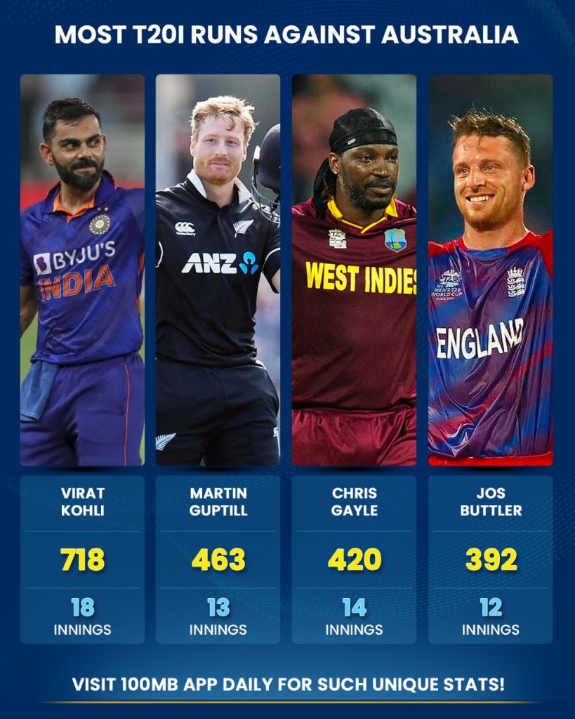 The star India batter, Virat Kohli finds himself in the first position for scoring the most runs in India-Australia T20 international matches. The 33-yeard old right-handed batter has slammed 718 runs in 19 matches at a staggering average of 59.83 and a strike rate of 146.23. In 18 innings, Kohli has smashed seven half-centuries, which is the most by any batter against the Aussies. His highest score is 90* with the top three best individual knocks by an Indian against the Kangaroos all coming from Kohli’s bat. He has also hit 55 fours and 22 maximums.
