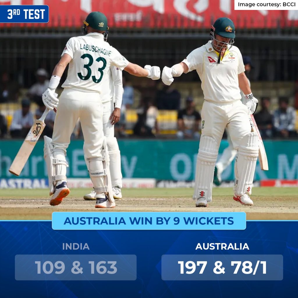 Australia completed a memorable victory after defeating India in the third Test match in Indore. The home side succumbed to their first defeat against Australia on home soil since 2017. Marnus Labuschagne and Travis Head starred for the tourists during a routine chase on the third day.