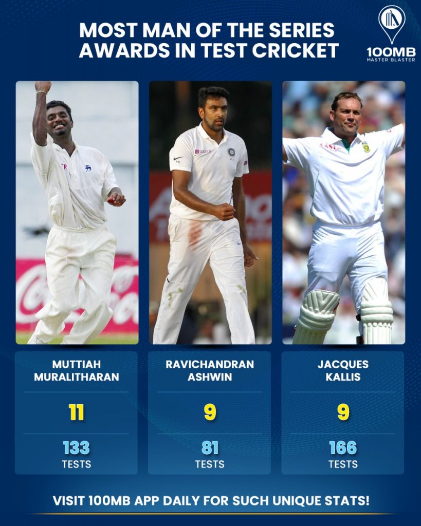 9 – R Ashwin won his ninth Player of the series award in Tests. Only Muttiah Muralitharan (11) is ahead of him.