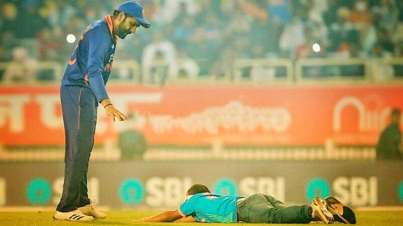 A die-hard cricket fan breached the security of the JSCA International Stadium Complex, Ranchi to touch Rohit Sharma’s feet during the 2nd T20I against New Zealand. Though the matches are played in strict bio-bubble environments, the fan bumped into the playing area and tried to touch Sharma’s feet. As soon as he chimed in, it caught the attention of the on-lookers.