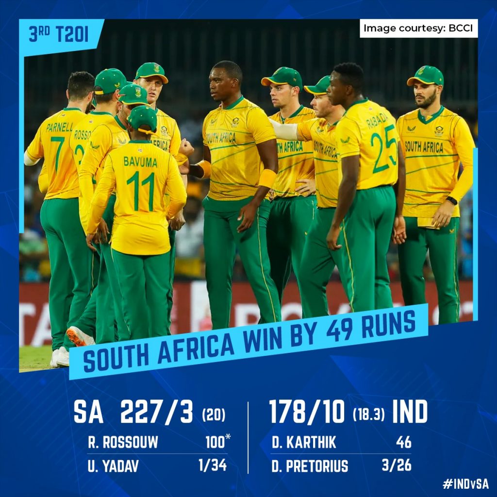South Africa won the third and last T20I match against India after an impressive all-round display in Indore. Rilee Rossouw smashed unbeaten 100 runs off just 48 balls to guide South Africa to a big 227/3 total while batting first. Then bowlers put impressive spells to bowl out India on 178 runs to register a big 49-run win.