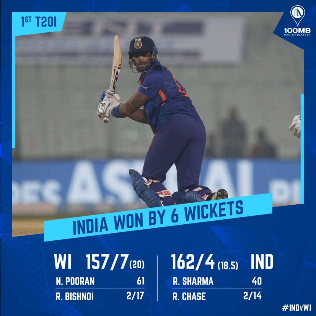 India took a lead of 1-0 in the three-match T20I series with a six-wicket win in the first game at Eden Gardens in Kolkata. The leg-spin duo of Yuzvendra Chahal and Ravi Bishnoi did most of the damage and strangled the West Indies batters with regular wickets.