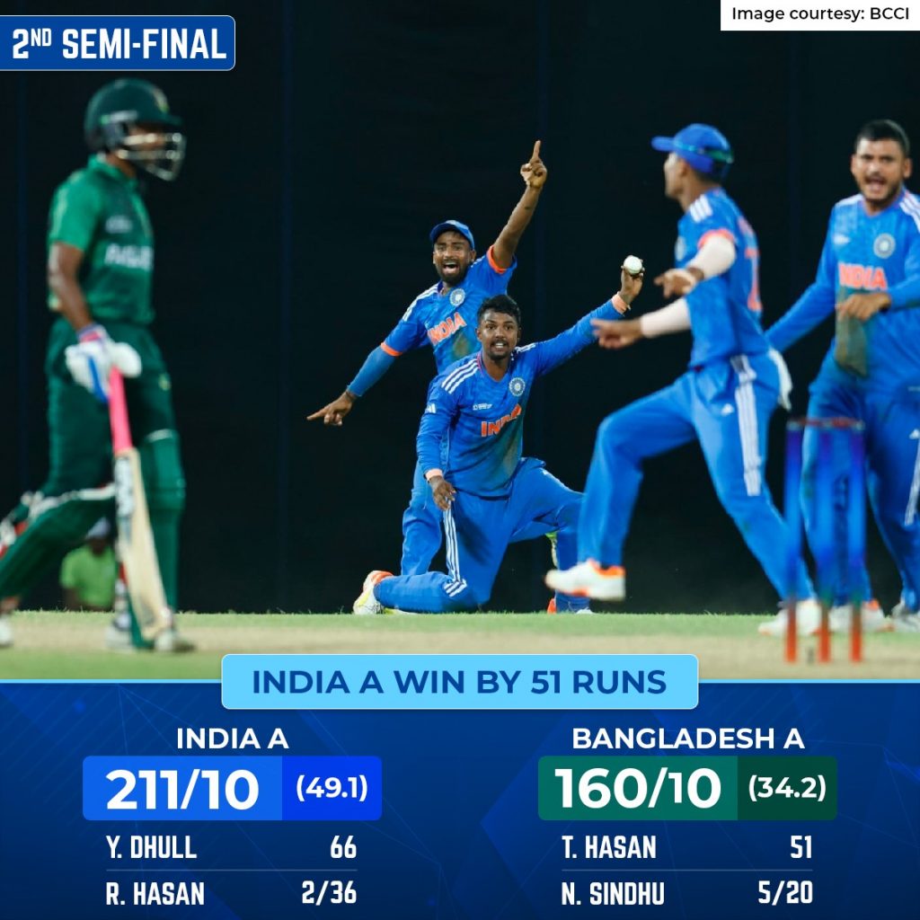 In a high-stakes semifinal clash of the ACC Men’s Emerging Asia Cup 2023, India A produced a stellar performance to secure a commanding 51-run victory over Bangladesh A, booking their place in the final. While India A’s batting display was not up to the mark, it was the magical five-wicket haul from the rising star, Nishant Sindhu, that proved to be the decisive factor in the match.