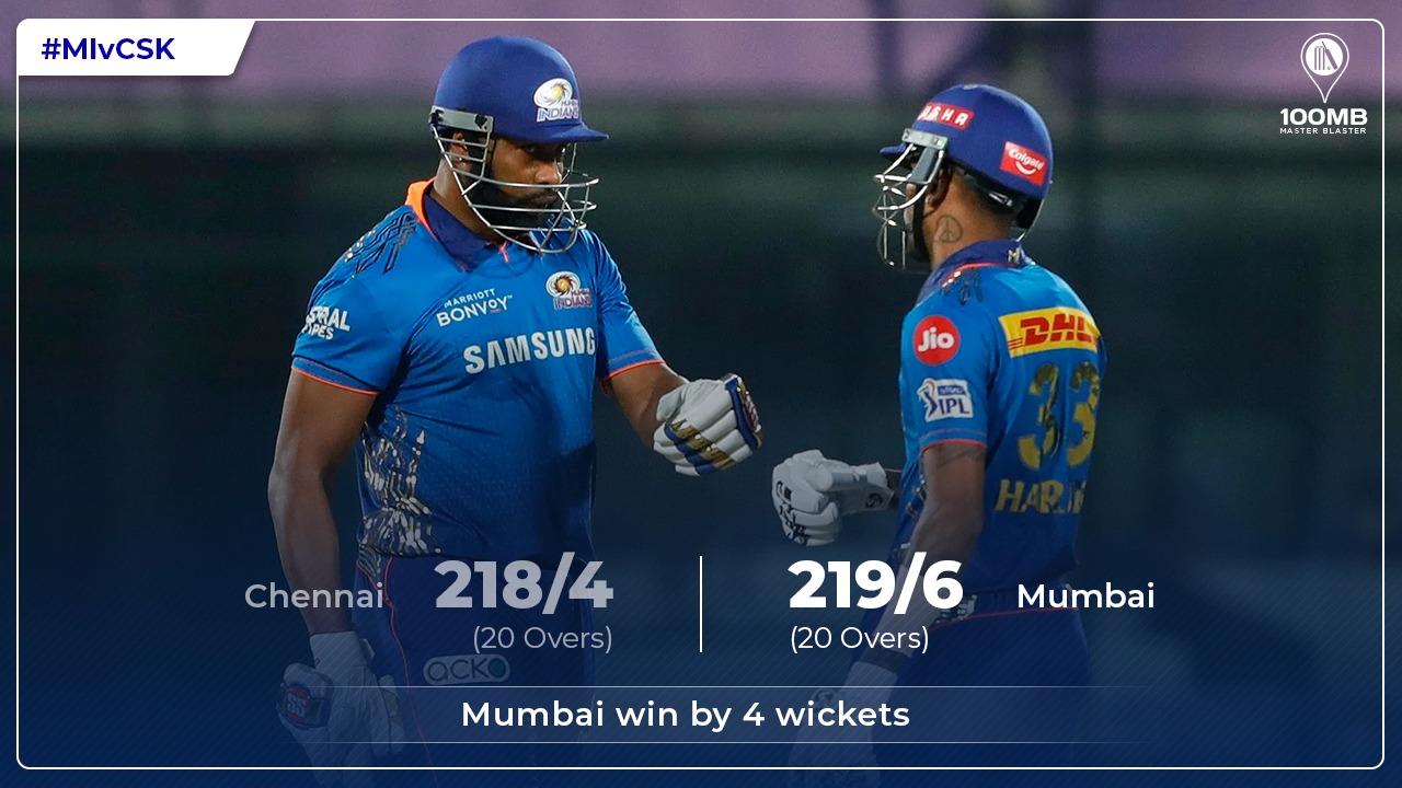 Earlier, MI got off to a good start with the ball after winning the toss and electing to bowl first. Ruturaj Gaikwad got out early but Moeen Ali and Faf du Plessis played good hands, scoring fifties each. Moeen fell for 58 while du Plessis got out for 50. The duo and Suresh Raina got out in quick succession, before Ambati Rayudu launched an assault on the Mumbai bowlers. Rayudu blasted 72 off just 27 balls and helped Chennai finish with a gigantic score of 218.