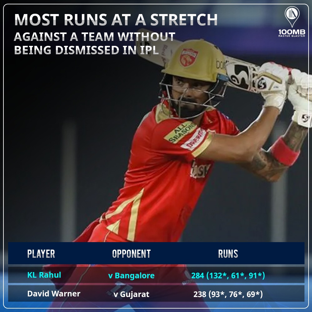 284 – KL Rahul has now scored 284 runs against Royal Challengers Bangalore after the last time he was dismissed against them. He now has three consecutive unbeaten innings with giant scores of 132*, 61*, and 91*.