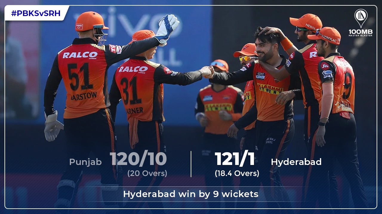Mayank Agarwal and Shahrukh Khan jointly scored the highest knock in the innings – 22. Punjab were bundled out for 120 all-out inside 20 overs courtesy some exceptional bowling from Hyderabad. Khaleel Ahmed picked up three wickets, while Abhishek Sharma got two scalps. Rashid Khan, Sidharth Kaul and Bhuvneshwar all chipped in with a wicket each.