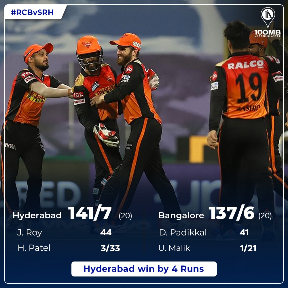 Royal Challengers Bangalore tried their best but failed to score a total that looked below par when Sunrisers Hyderabad finished their innings. In a nail-biting finish in Abu Dhabi, Hyderabad came out victorious, marking only their third win this season.