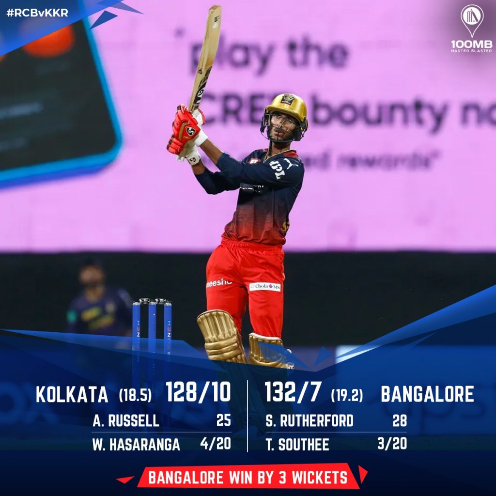 Du Plessis won the toss and opted to field first as expected, and KKR did not have the best of starts as they lost their openers Venkatesh Iyer and Ajinkya Rahane in quick time. Shreyas Iyer, Nitish Rana, and Narine all started well but could not build on that and were dismissed soon. Sheldon Jackson fell for a duck and it was up to Sam Billings and Andre Russell to stitch a partnership. However, RCB kept taking wickets at regular intervals and KKR could only score 128 in their innings.
