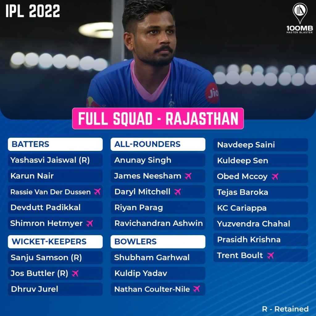 The inaugural IPL season winners Rajasthan Royals (RR) retained three players Sanju Samson, Jos Buttler, and Yashasvi Jaiswal before the mega auction. After the event concluded, their squad comprises 24 players including 16 Indians and 8 overseas. The franchise invested heavily in four players in the form of Prasidh Krishna, Trent Boult, Devdutt Padikkal, and Shimron Hetmyer spending a total of INR 34.25 crores on them. In this article, let us do a SWOT article on the RR side.