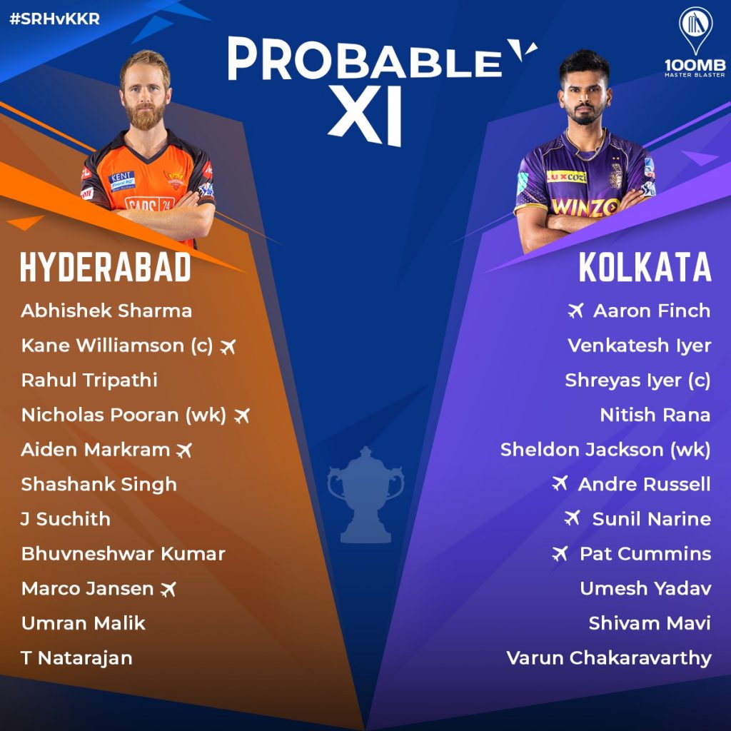 Predicted XI for Sunrisers Hyderabad vs Kolkata Knight Riders