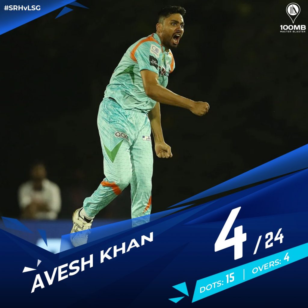 Avesh Khan was back at his best for the Lucknow Super Giants as the right-arm seamer picked up four wickets for just 24 runs in his four-over spell. Avesh got the early breakthroughs of the openers Abishek Sharma and Kane Williamson and returned to pick up the dangerous Nicholas Pooran who was taking the game away from the Lucknow side.