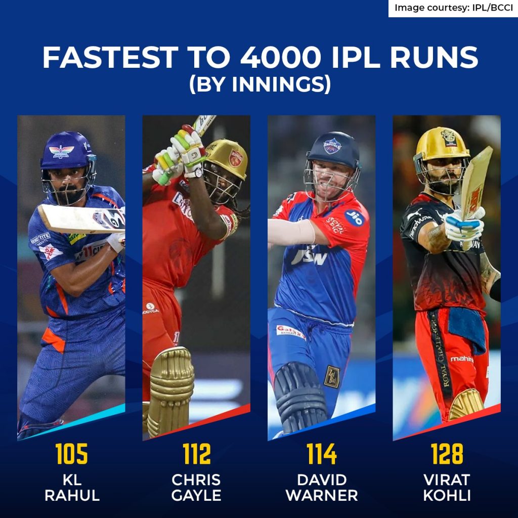 Rahul broke Gayle’s record for fastest to 4000 runs in IPL tournaments as he smashed his 32nd fifty in the tournament on April 15. He took just 105 innings to achieve the milestone and also became the fastest Indian captain to score 2000 runs in IPL. Rahul has scored 4044 runs from 105 innings at an average of 47.02 and a strike rate of 135.16 with four centuries and 32 fifties so far.