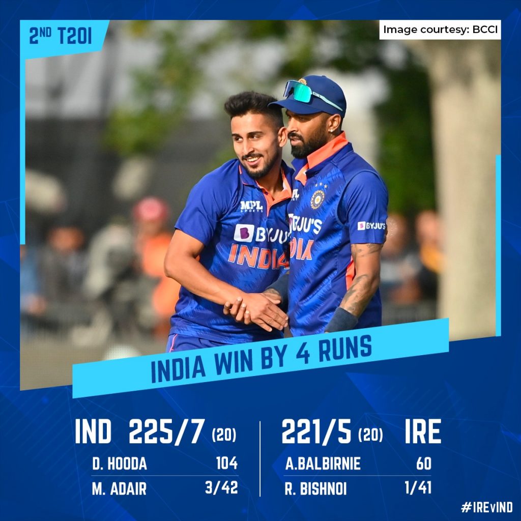 Team India defeated Ireland by four runs in the second and final T20I to clinch the series 2-0. It was a high-scoring thriller at the Malahide Cricket Club as the ball was flying all over the park. Ireland fell agonizingly short of India’s target of 226 runs in a game that went down to the wire. With this triumph, Hardik Pandya lifted his first trophy as the Indian skipper.