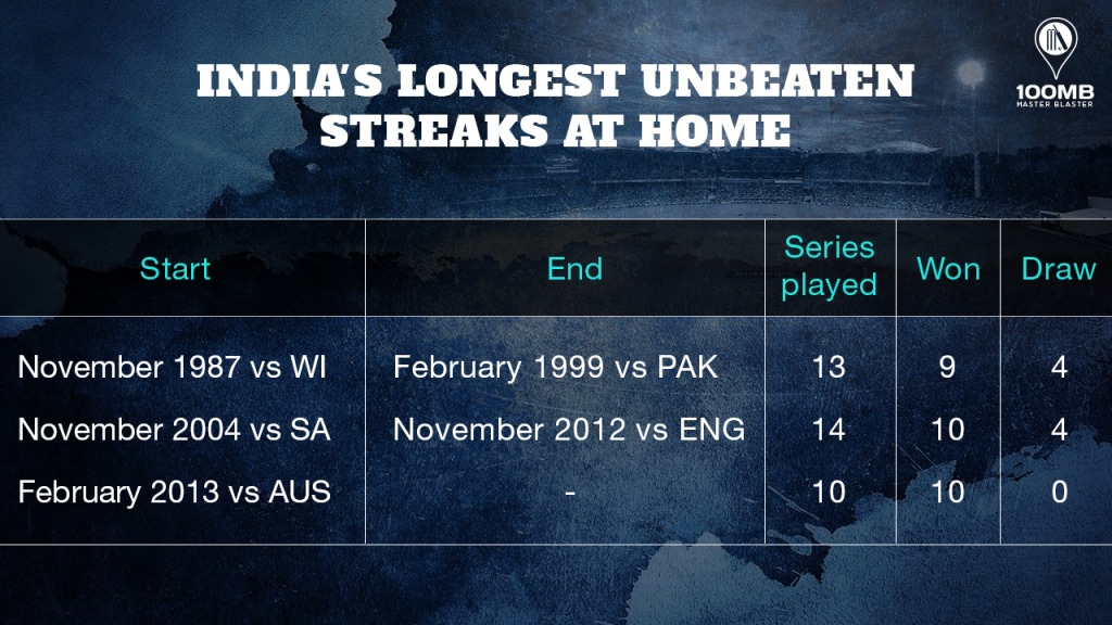 Make no mistake, India were a force at home for many preceding years. The records inform us that from November 1987 to February 1999, India did not lose a Test series at home. The team regularly strung together such long defeatless patches with a singular loss spoiling the streak. Australia in 2004 and England in 2012 were those spoilers.
