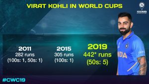 But Kohli’s run-scoring in this tournament has shed some light on his batting pattern across the three World Cups that he’s been part of. In his debut World Cup game in 2011, he smashed an unbeaten 100 against Bangladesh but went on to register only five two-digit scores with a solitary fifty. In 2015, he repeated the feat of scoring a hundred in the opening match, against Pakistan. His next best score was 46. By that measure, this year’s World Cup has been Kohli’s most successful one yet, and he doesn’t even have a hundred. Just five fifties. And he’s only getting progressively better.