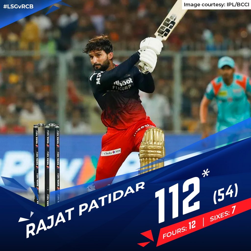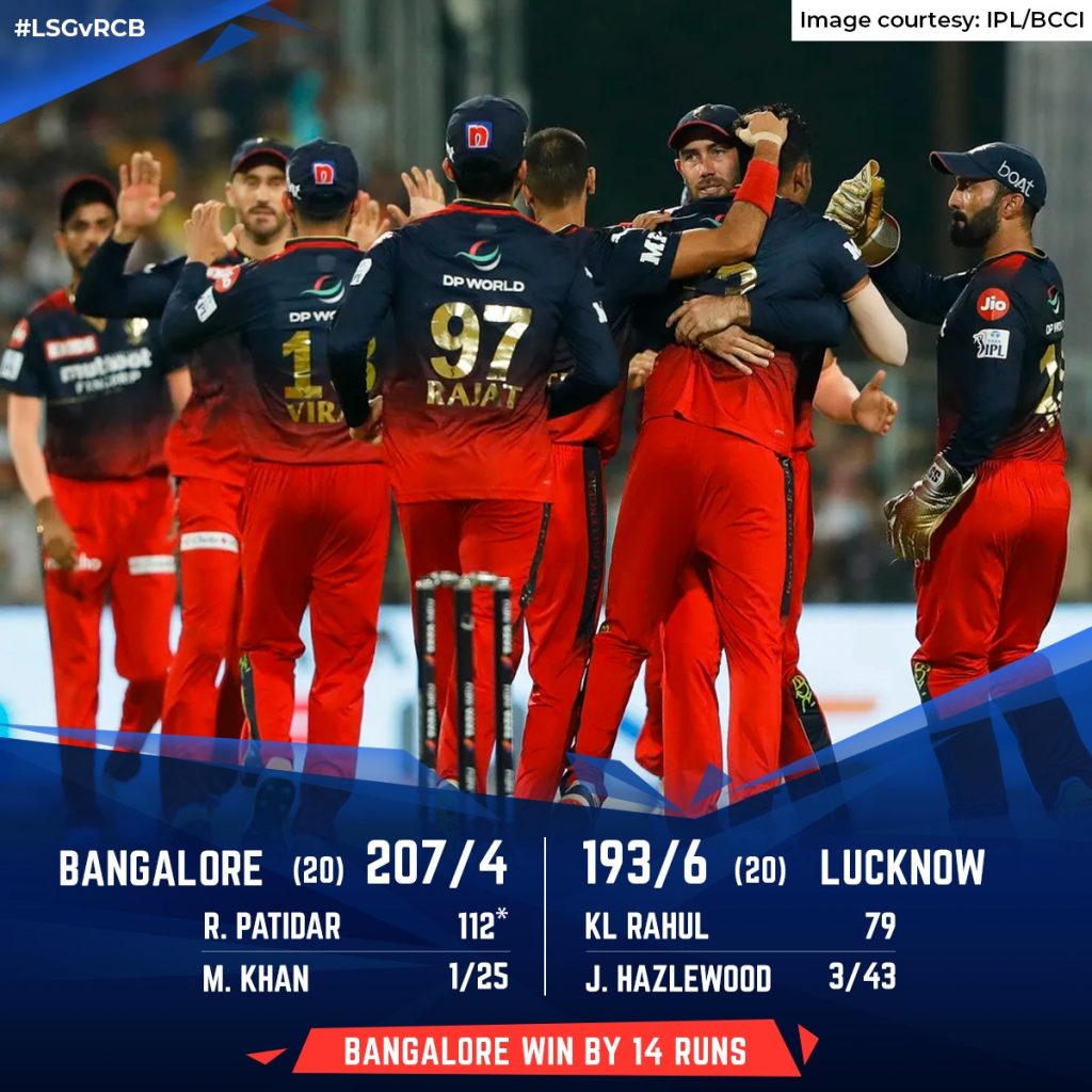 Earlier in the game, LSG bowled first after winning the toss and skipper Faf du Plessis for RCB was dismissed early by a peach from Mohsin Khan. Virat Kohli stitched a good partnership with Rajat Patidar, but the former fell after a 24-ball 25 while Glenn Maxwell followed him soon. However, the partnership between Patidar and Dinesh Karthik (37*) gained momentum and the former brought up his first IPL century in a high-pressure encounter.