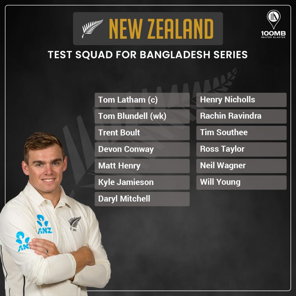 New Zealand’s 13-man squad for Bangladesh Tests: Tom Latham (C), Will Young, Daryl Mitchell, Ross Taylor, Henry Nicholls, Tom Blundell (wk), Rachin Ravindra, Kyle Jamieson, Tim Southee, Neil Wagner, Trent Boult, Matt Henry, Devon Conway
