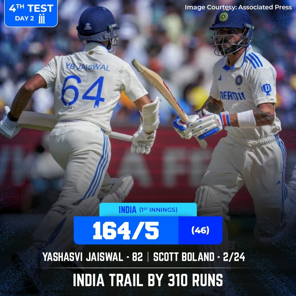 As India began their batting, the team got off to a poor start with skipper Rohit Sharma failing to impress again. India’s woes continued after KL Rahul, the side’s best batter of the series, was dismissed by a cracker of delivery by Cummins after adding 24 runs. From there on, it was Yashasvi Jaiswal and Virat Kohli’s cautious batting that kept the tourists in the game. The southpaw reached his fifty in 81 balls. On the other hand, his senior partner complemented him well and played some beautiful shots. In the final overs of the day’s play, Jaiswal and Kohli both lost their wickets along with night-watchman Akash Deep making a walk back to the dressing room. India’s scorecard read 164/5 after batting 46 overs.