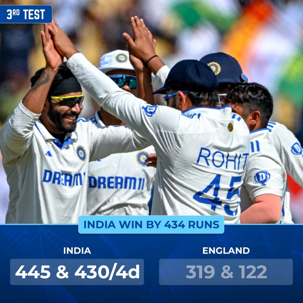 Day 4 of the third Test between India and England turned out to be one-sided as the hosts dismissed their opponents for 122 in the fourth innings to register a record-shattering 434-run victory. They also went 2-1 up in the five-match series with this win.