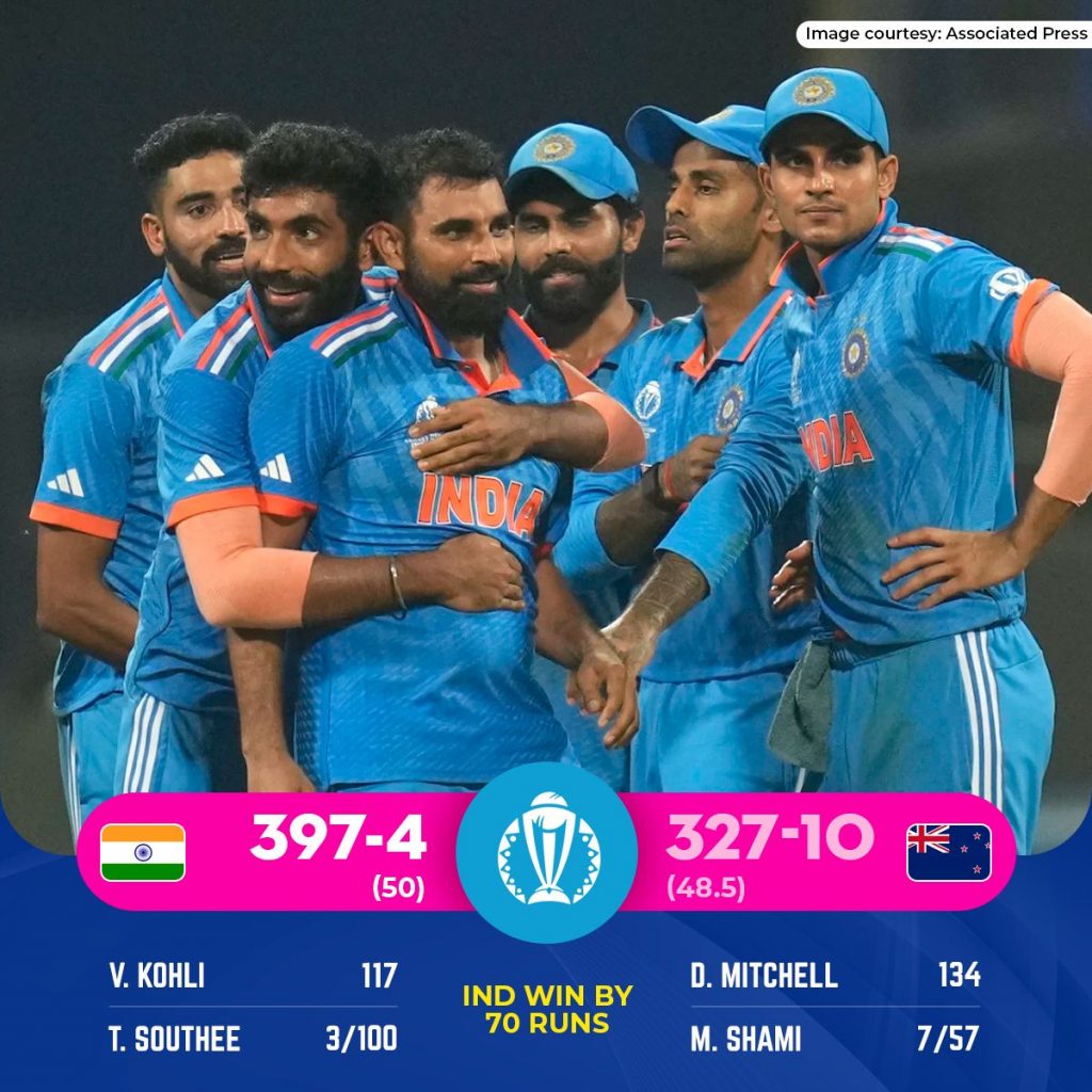 The semifinal match of the ongoing ODI World Cup took place at the Wankhede Stadium in Mumbai, where India and New Zealand faced off and the Indian juggernaut rolled on as India won by 70 runs to advance to finals.
