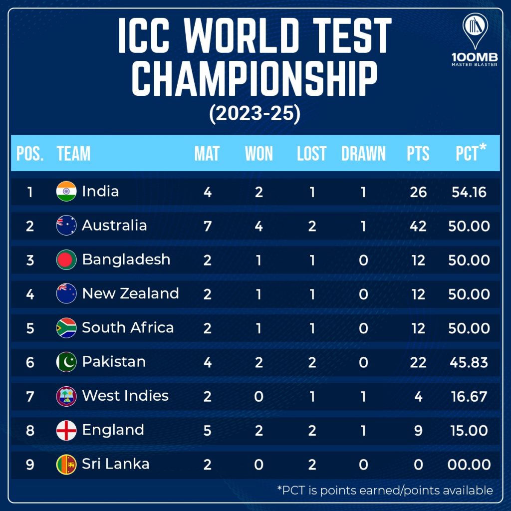 Courtesy of their win, India has taken a giant leap in the World Test Championship (WTC) standings for the 2023-25 cycle. They now find themselves on the top of the table with 26 points from four matches. India has a points percentage of 54.16%.