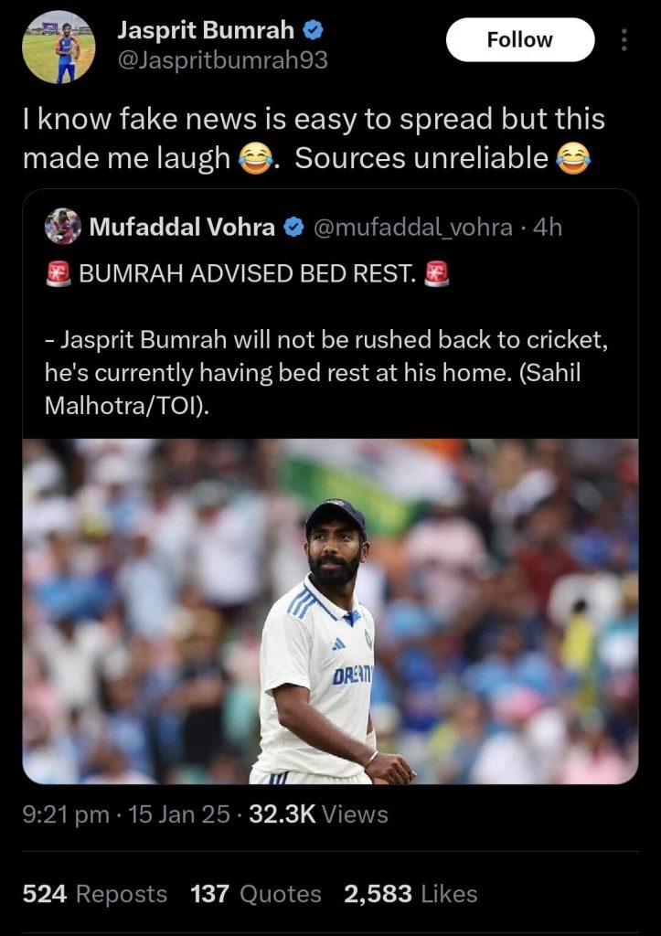 Star Indian speedster, Jasprit Bumrah, has firmly denied the recent reports about him being advised bed rest following his back injury during the Border-Gavaskar Trophy. Taking to social media, Bumrah called the news fake and said it got him laughing, quashing speculation about his recovery and participation in upcoming tournaments.