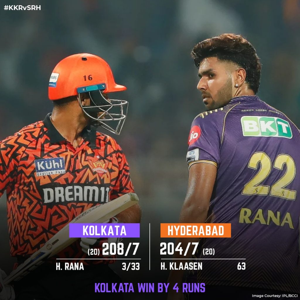 Chasing a challenging target of 209, SRH looked in total control during the powerplay. Mayank Agarwal (32) and Abhishek Sharma (32) put them on the pedestal while contributions from Aiden Markram (18) and Rahul Tripathi (20) weren’t enough as the required run rate soared. Though Shahbaz Ahmed chipped in with 16, Heinrich Klaasen (63 off 29) could not stay till the last ball and KKR clinched a thriller by four runs as Harshit Rana defended 13 off his double-wicket last over after KKR leaked aplenty in the previous three.