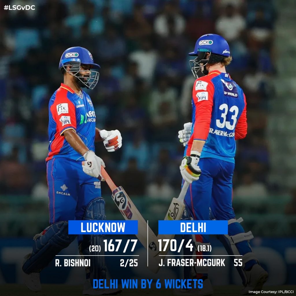 In reply, Delhi chased down the target in 18.1 overs courtesy of a half-century from Jake Fraser-McGurk and a brilliant knock of 41* (24) by captain Rishabh Pant. After the win, Delhi moved to the second-last position on the points table with four points from six matches. While Lucknow retained the fourth spot with six points from five matches.
