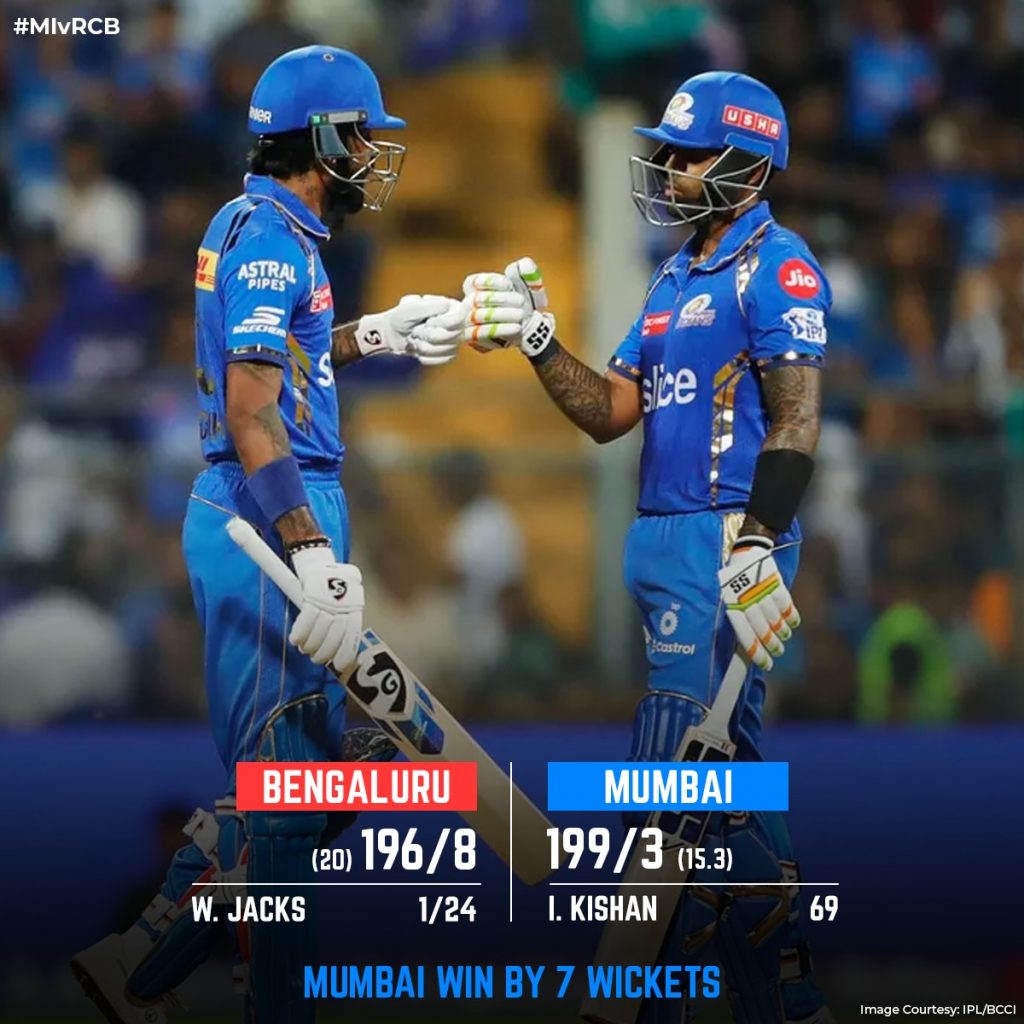 Coming to the chase, the home team came all guns blazing against a hapless RCB attack. Ishan Kishan did the bulk of the scoring in the opening partnership for MI, scoring a quickfire 69 off 34. While Rohit Sharma was a mere spectator at the other end for most of the stand. Suryakumar Yadav, who got dismissed for a silver duck in MI’s previous clash, smashed a quickfire 52 off 19. Hardik Pandya and Tilak Varma finished off the chase in a hurry, with the former striking three maximums and the latter stroking four to grant MI a seven-wicket win with 27 deliveries to spare.