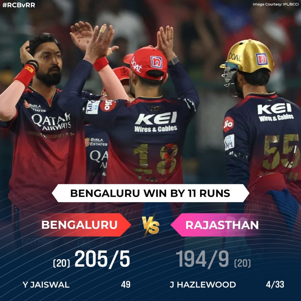 Royal Challengers Bengaluru defeated Rajasthan Royals by 11 runs in Match 42 of the ongoing edition of the Indian Premier League at the M Chinnaswamy Stadium on Thursday, April 24. With this victory, RCB completed the double over RR and also won their first home game of the season.
