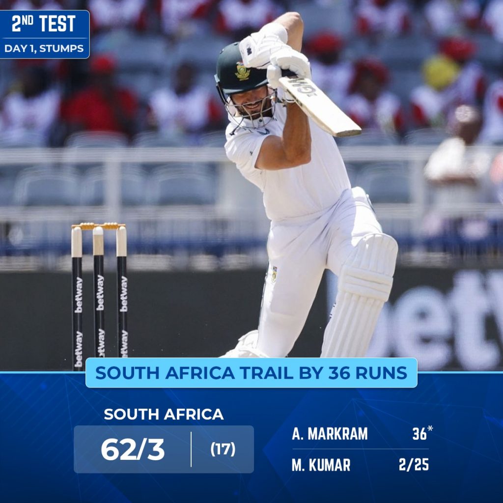 In the second innings, South Africa got off to a sedate start as Markram and Elgar added 37. Mukesh Kumar dismissed the southpaw by getting him out at first slip in his final Test innings. Kumar struck again in his next over, sending Tony de Zorzi packing. Bumrah then picked up Tristan Stubbs, the 23rd and last wicket to fall on a happening Day 1. South Africa finished the day on 62/3, trailing by 36 runs.