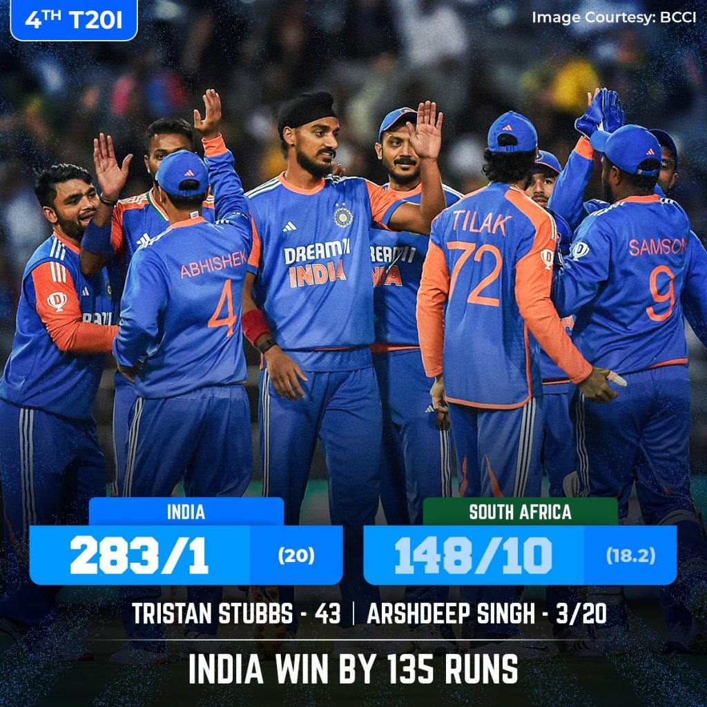 The fourth T20I began with the Indian team coming in to bat first and the visitors put in a performance of a lifetime. After the dismissal of Abhishek Sharma for 36, Sanju Samson and Tilak Varma wreaked havoc as both completed their centuries. Samson scored 109 runs in 56 deliveries whereas Tilak scored a lightning-fast 120 in 47 deliveries, helping India post a record 283 in the first innings.