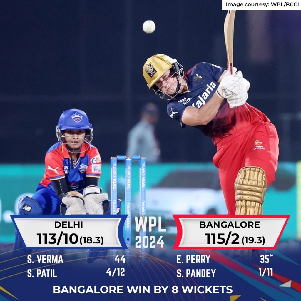 Royal Challengers Bangalore Women won the second edition of the Women’s Premier League with an eight-wicket win over Delhi Capitals Women in the final on Sunday, March 17 at Arun Jaitley Stadium, Delhi. After winning the toss and opting to bat first, Delhi was bundled out for 113 in the first innings in 18.3 overs.