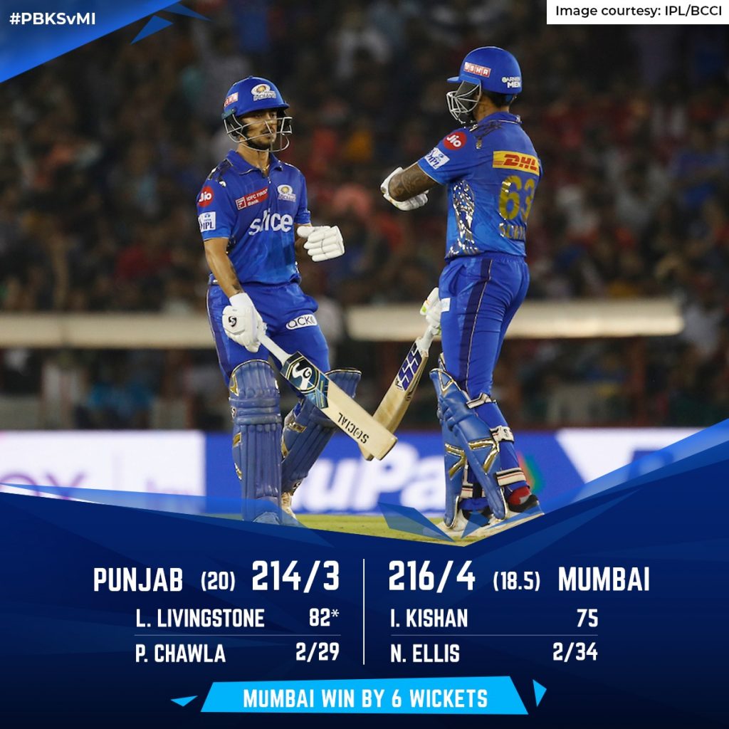 Shikhar Dhawan-led Punjab Kings came second best against Mumbai Indians at the Punjab Cricket Association IS Bindra Stadium in Mohali on May 3 as the visitors gunned down 215 with six wickets in hands, winning on the back of quickfire half-centuries from Ishan Kishan and Suryakumar Yadav along with the finishing touches from Tilak Varma and Tim David.
