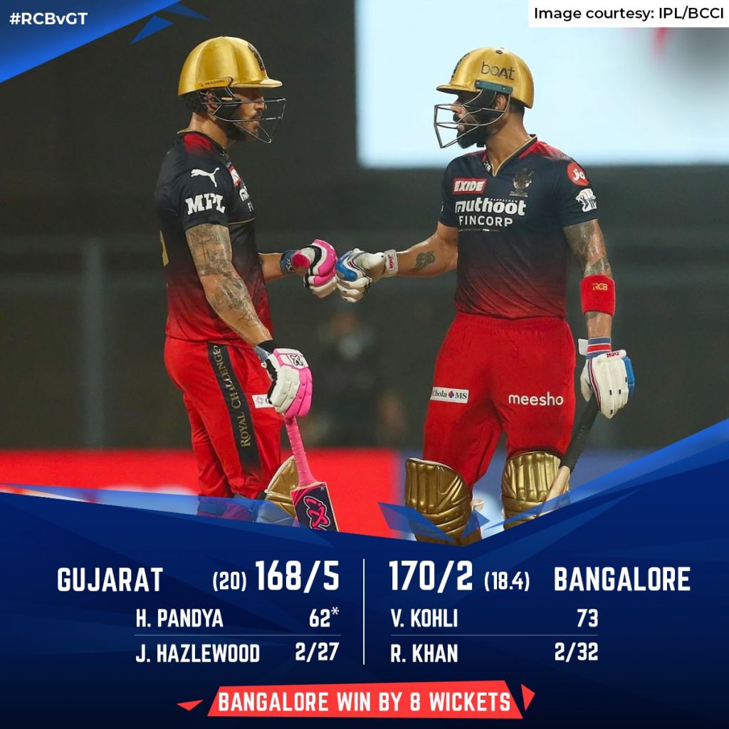 In reply, the Royal Challengers Bangalore made their intentions clear in this virtual knockout game as batting megastar Virat Kohli rediscovered his mojo and anchored the run chase successfully as he went on to score his second half-century of this season. He along with skipper Faf du Plessis added 115 runs for the opening stand before the latter was dismissed for 44 runs from 38 balls. Virat looked set for a big score until he was outfoxed by Rashid Khan for a 54-ball 73.